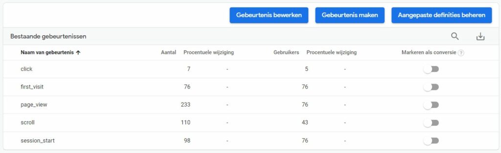 In Google Universal Analytics stelde je een doel bijvoorbeeld in door het toevoegen van een bestemmingspagina. Het instellen van doelen is nu niet meer mogelijk op die oude manier; je stelt deze nu in als ‘gebeurtenissen’. Belangrijke gebeurtenissen stel je vervolgens weer in als conversie, zodat je precies in de gaten kunt houden welke relevante doelen voor jouw organisatie behaald worden. In GA4 staan alvast standaard gebeurtenissen klaar, zoals in de afbeelding hieronder te zien is.