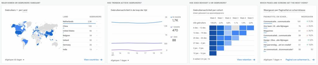 Hoe lang blijven bezoekers op je website? Waar wordt op geklikt? Waar wordt er gescrold? Zijn er nieuwe of terugkomende bezoekers? In Google Analytics 4 is dit een stuk overzichtelijker geworden, door kant-en-klare overzichten. Wanneer je meerdere campagnes aan hebt staan, geeft GA4 bijvoorbeeld al aan welke campagne afgelopen maand voor de helft van jouw conversies zorgde. Op deze manier krijg je snel inzicht in de prestaties en effectiviteit van je verschillende campagnes en kanalen. Ook geeft GA4 je een presentatie van week tot week. Vanaf de homepage zie je dus al snel een stuk meer dan in de vorige versie van Google Analytics. Een mooie ondersteuning.